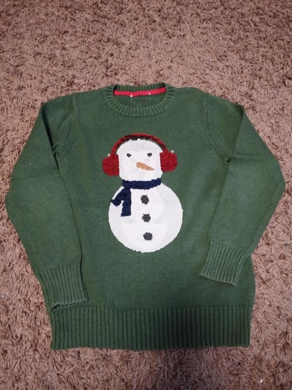 Симпатичная новогодняя кофточка для девочки с пайетками (снеговик-пингвин). Хорошее состояние. Длина рукава 47 см, длина по спинке 52 см. Ориентировочно 7-8 лет.