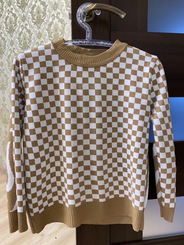 Колір- коричневий з білим Опис : приємна на дотик, не змінює колір, не линяє. Ширина плечей: 40 см Довжина рукава: 53 см Довжина кофти: 58см Ширина кофти: 54 см Особливості : з двохсторін різний принт. Декілька разів лише одягнута(дитина виросла)