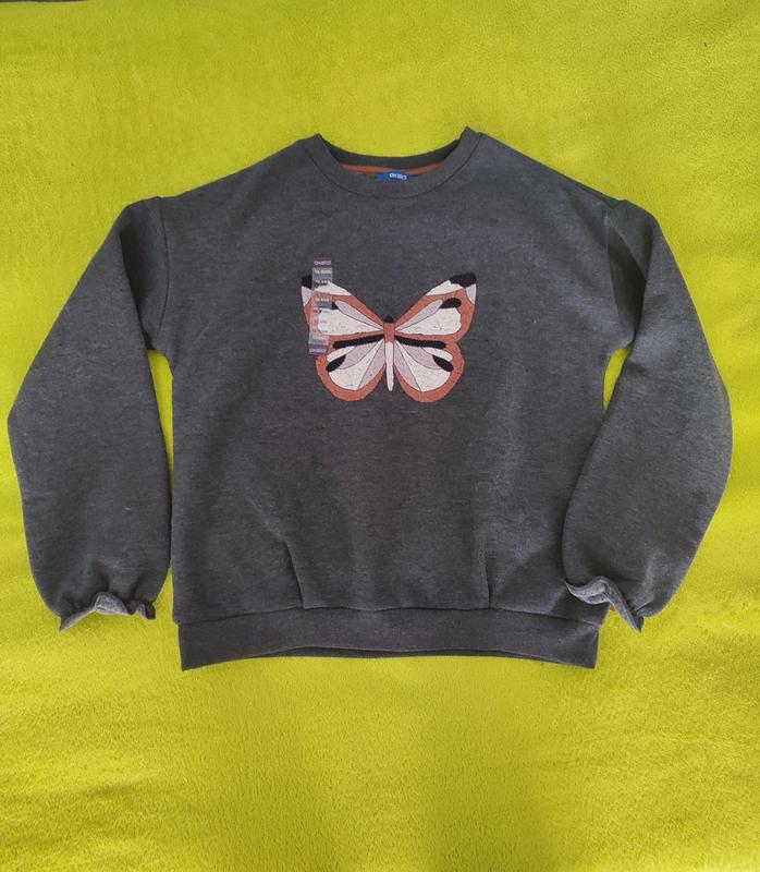 Теплая кофточка на девочку 10 лет (140 см). Имеет флисовый начес внутри и красивой вышитой бабочки на груди. Рукава собраны резинкой, в низ манжетом. Состав: 50% которое, 50% полиэстер. Одягали 1 раз.