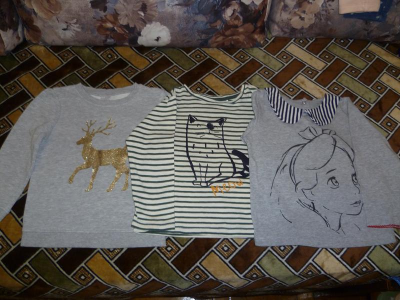 Детские кофты, футболка, в идеальном состоянии. Футболка серая с олененкой утепленная с начесом, размер 98 см., длина 38 см., длина рукава 32 см., фирма Palomino коттон. Футболка в полоску аппликация - котик размер 3/4 104 см., длина 34, рукав 30 см., фирма Zara, производитель Турция, коттон. Футболка с аппликацией девочки, размер 3/4 года, 104 см, длина 36 см., длина рукава 30 см., состав ткани коттон. Цена одной кофточки футболки 76 грн, за три вместе 190 грн.