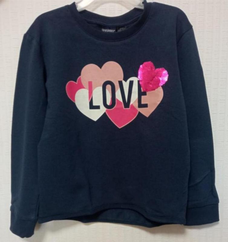 Хлопковый свитшот на девочку с ярким принтом с паетками от брендового производителя lupilubез утепления,двухнитка. Замеры 110/116 длина спереди 42,зади 45см. дпг-39 длина рукава от плеча-40см.