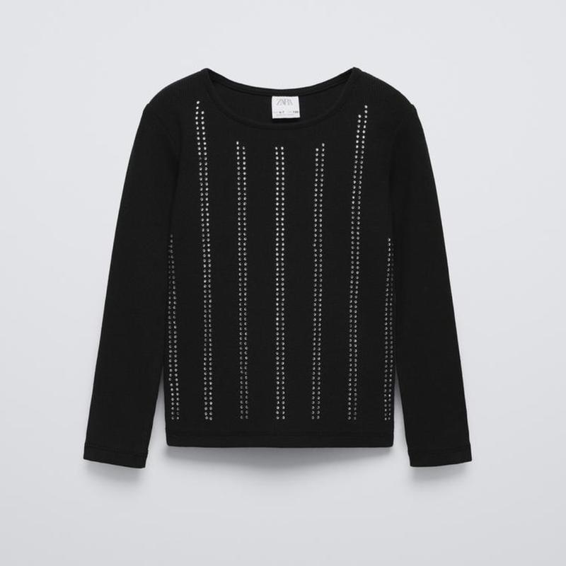 Лонгслив черного цвета в рубчик с декором - мелкими стразами в наличии размер 📌 152 11-12 лет полуобхват груди 34 Длина от плеча 53 Длина рукава с плечом 61 95 бавовна 5 еластан Zara оригинал с бирками
