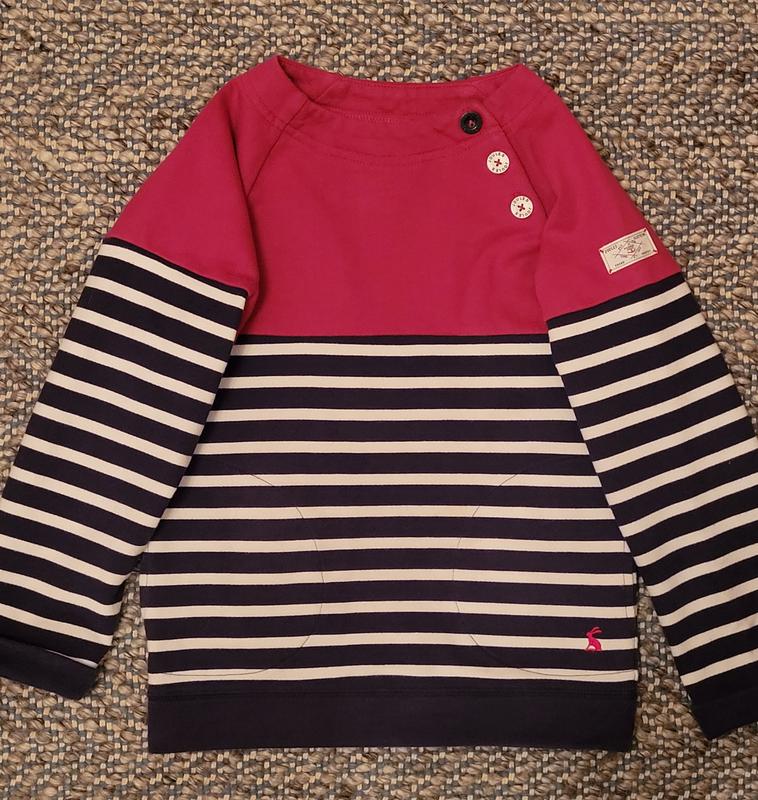 Полосатый реглан в многоцветной гаммахе из трикотажного эластичного джерси. 60% котон; 40% полиэстр. Застежка-планка с брендированными пуговицами, является запасной.Рукав реглан.В боковых швах 2 кармана. В нижней части левого кармана вышит логотип бренда "игривый зайчик" ПОГ 36. Длина по спинке 50. Длина рукава от горловины 52 см. В хорошем состоянии, без нюансов. На все вопросы ответь в переписке.