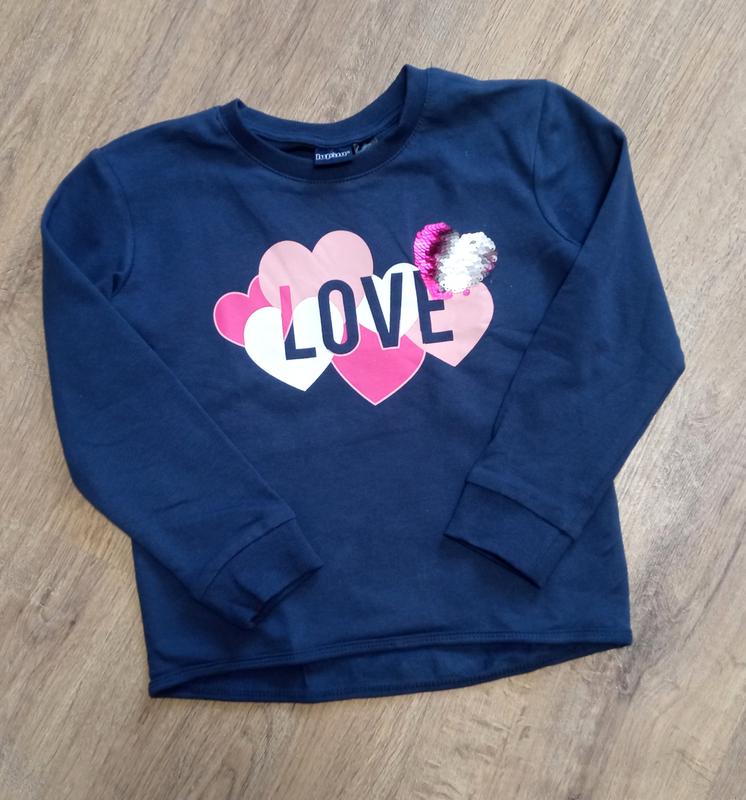 Хлопковый свитшот на девочку с ярким принтом с паетками от брендового производителя lupilubез утепления,двухнитка. Замеры 110/116 длина спереди 42,зади 45см. дпг-39 длина рукава от плеча-40см.