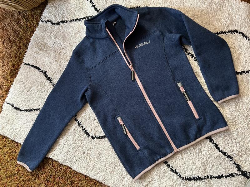 Теплая кофта на замке, может быть вместо ветровки, утеплена флисом. Бренд On the Peak. Спортивна. Размер 134-140. Заміри на фото. Стан идеален. Цвет синий., розовые вставки, замок, светоотражающие элементы. Воротник стойка. Очень теплая и удобная.