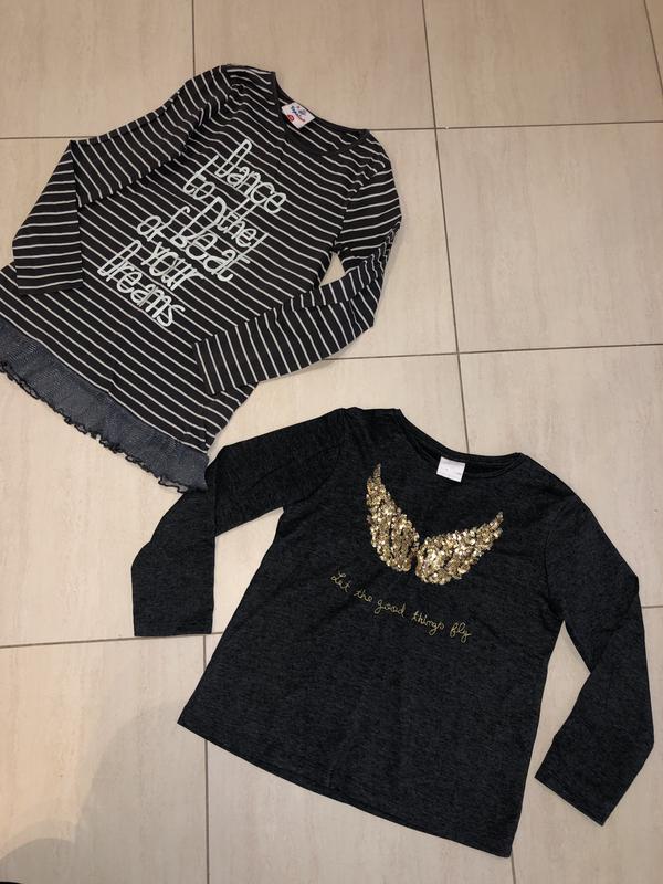 Лонгслив с крыльями из пайеток ( Zara) темно-серый и серый в полоску, хлопок. Стан - идеальный. Эффекты отсутствуют. Цена за два.