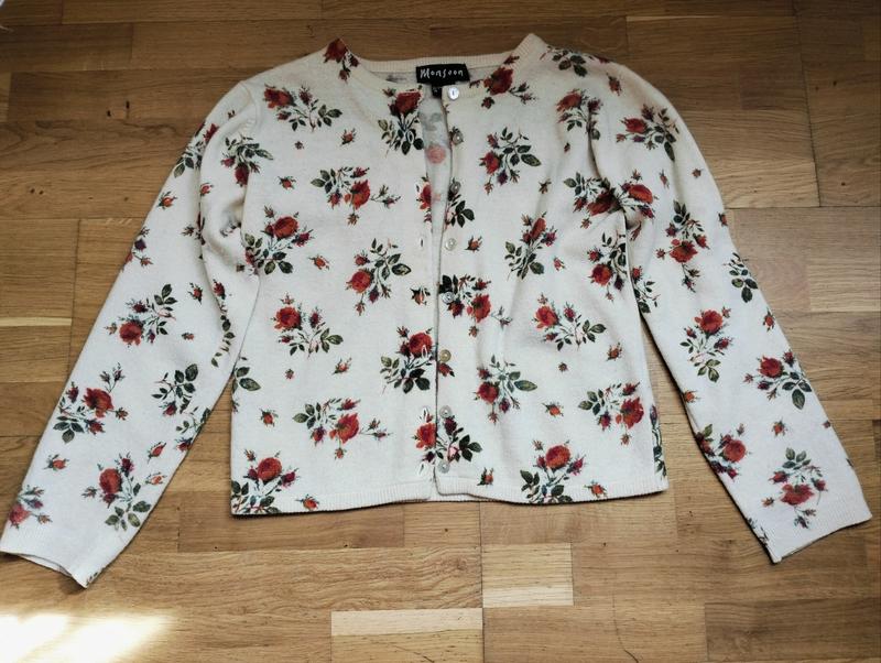 Тепла ошатна кофта для дівчинки 8-11років. Усі заміри та склад пряжі на фото. Без ковтунців та інших дефектів. Колір пряжаного молока + трояндочки. Купували в школу, але вдівали кілька разів, бо були на дистанційному навчанні. Дорога презентабельна річ, куплена закордоном.