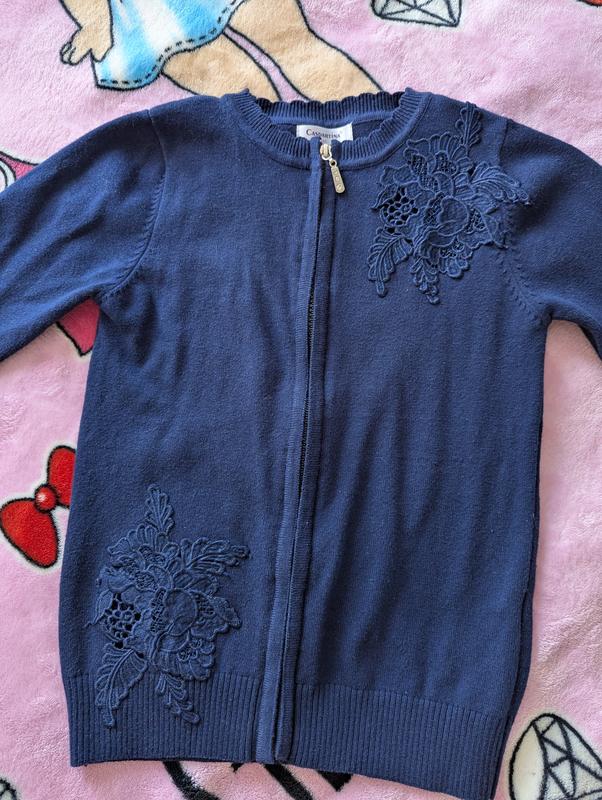 Очень красивая кофта для девочки. Недостатков нет,так как одевалась один раз. Цвет красивый, за счет аппликации с переда - смотрится шикарно)