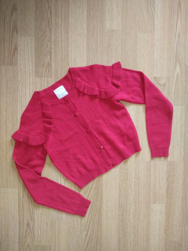 Яркая праздничная кофточка с рюшей на девочку в идеальном состоянии. Фирма Terranova. На возраст 9-11 лет Длина 39 см, рукав от шеи 60 см, ПОГ 36 см.