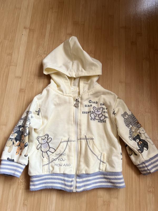 Кофта для девочки 68 р (3-6 мес) Цвет - свет желтый с рисунком мишки С карманами, на молнии также мишка Замер Длина 30 см ПО груди 27 см Рукав 23 ( уже с резинокой 3 см) Хлопок 100% без утеплителя