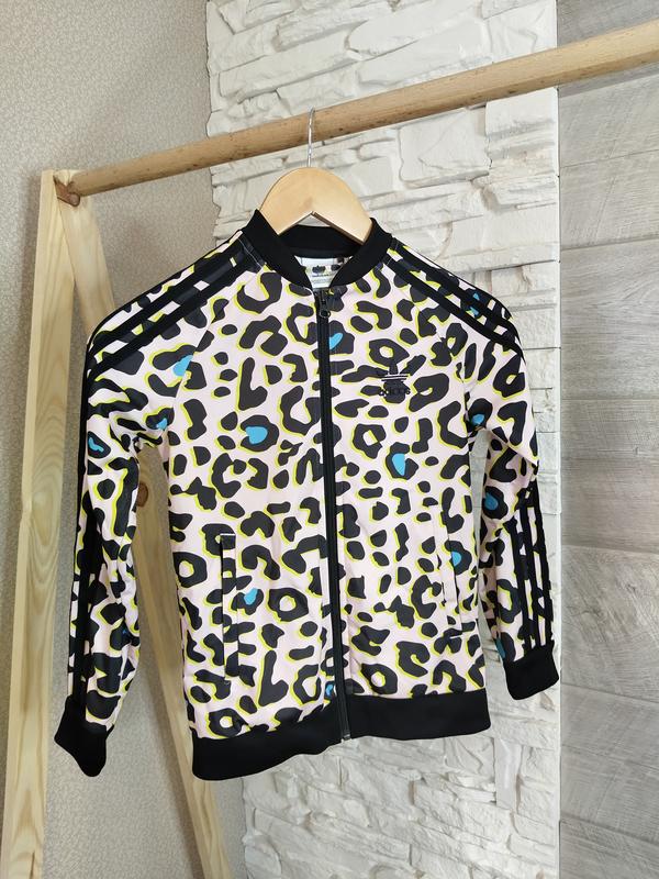 Дитяча оригінальна спортивна кофта на змійці Adidas леопардовий принт дуже стильна та якісна стан ідеальний розмір по бірці 9-10 років заміри довжина по спинці 51 см ПОГ 40 см довжина рукава від горловини 59 см ширина по низу 37 см на резиночці