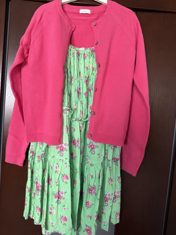 Платье и кофта на девочку 8-9 рочков. Платье очень легкое и приятное, 100% вискоза, не ощущается на теле + кофта в комплекте. Состояние новых вещей!