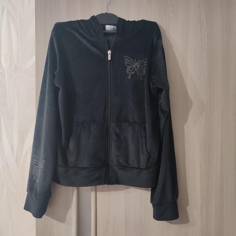 Черная бархатная кофта на девочку 11-12 лет В идеальном состоянии Рост 152 см Кофта детская с карманами и молнии Кофта со стразами Котон+ полиэстер