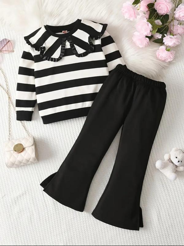 Набор для маленькой девочки: повседневная рубашка-лялька с воротничком и полосками, длинный рукав и черные широкие брюки -весенчато-осенний комфортный 2-тюгический комплект, идеальный для улицы.рост 100