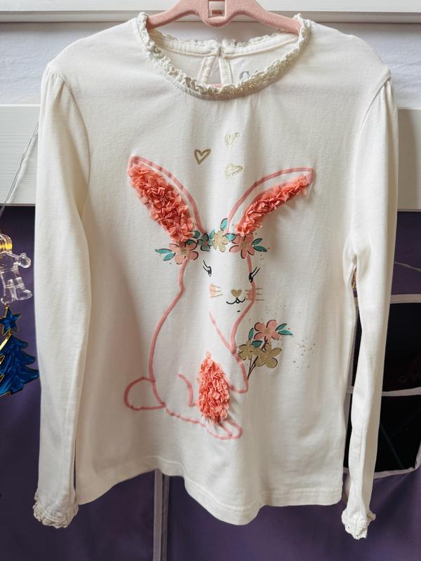 Дуже гарний лонгслів для дівчинки, сзаду на одному ґудзику. Комірець і рукавчики оздоблені мереживом на резиночці. Гарний принт кролика.