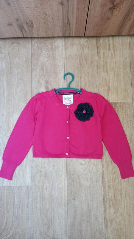 Очень красивая укороченная кофточка, болеро на девочку. По наборке 7-8 лет 128 см. В хорошем состоянии. 100% котон. Застегивается на четыре пуговицы (красивые, блестящие). Рукавчик можно подкатить. Сбоку пришитый цветок в горошек, которая украшает кофточку. Кофточка подойдет на летнюю прохладу, накинуть на футболку или платье. А также на теплую весну-осень. Очень красиво дополнит и украсит образ!