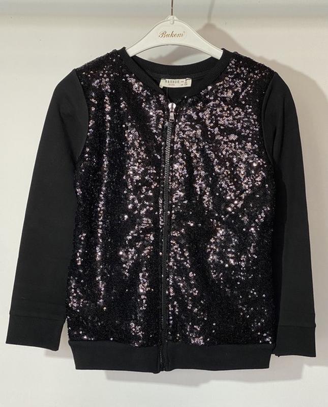 Кофта с пайетками для девочки 14 лет, рост 164 см, черного цвета, на молнии. Спереди вышивка пайетками, по бокам карманы. Замеры: длина рукава - 55 см, длина по спинке - 57 см, ширина - 43 см. Склад: 95% бавовна, 5% еластан.