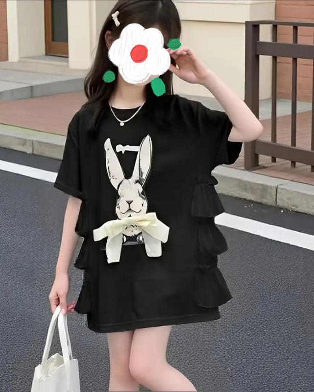 Летняя футболка туника для девочек со свободным кроем и принтом зайчика Очень классная и стильная На бирке 7 лет, подойдет лучше на рост 110 Длина 58 см