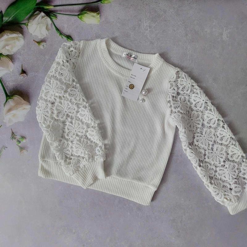 Нарядна кофтинка для дівчат. Прикраса в комплекті. Тканина - трикотаж вафелька, рукав - макраме. Колір - молочний. Заміри: 122 довжина - 39см, напівобхват грудей - 38см, рукав від плеча - 43см.