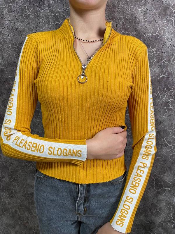 Жіноча кофта в рубчик жовтого кольору з коміром-стійкою на блискавці та білими смугами з написом «PLEASENO SLOGANS» на рукавах.