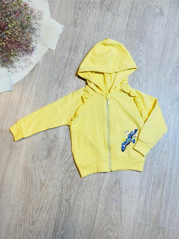 Дитяча кофта для дівчинки 92 см в жовтому кольорі від польського бренду 5.10.15. Застібка на змійку. Має глибокий капюшон. Утеплена на двонитці. Дві кишені з переду. Малюнок пташки, прикрашений паєдками. Прикрашена вставками з рюшів. Тканина: 100% бавовна. Доставка в межах міста Одеса безкоштовно на замовлення від 300 грн.