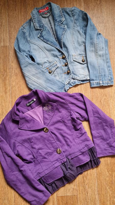 Джинсовая куртка и пиджак в школу, на рост 128. Замеры : фиолетовый пиджак длина 44см, ог 36см, рукав от плеча 45см шаговый 36см, джинсовая длина 41 см, ог 34см, рукав 48см шаговый 36см. Цена указана за 2шт