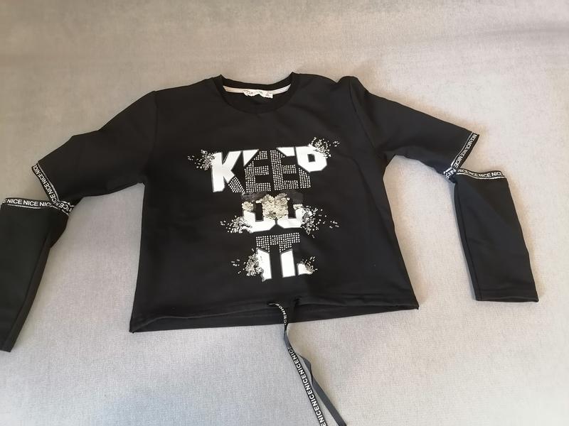 Кофточка для девочки 12 лет. На рост 152 см. Черная с серебристыми лентами. З пайетками. На лигтях отверстия. Очень стильная и красивая. Заміри надала на фото.