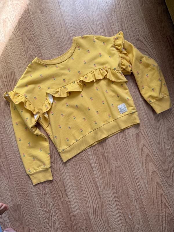 Кофтинка в ідеальному стані. Колір дуже красивий: між жовтим і помаранчевим. На фото колір передає фото номер 1. Органічна бавовна. Купували для школи, але швидко переросли. Вдягали кілька разів. Заміри на фото.