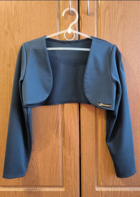 Однотонное детское болеро темно-синего цвета, в очень хорошем состоянии. Все замеры находятся на фото в объявлении.