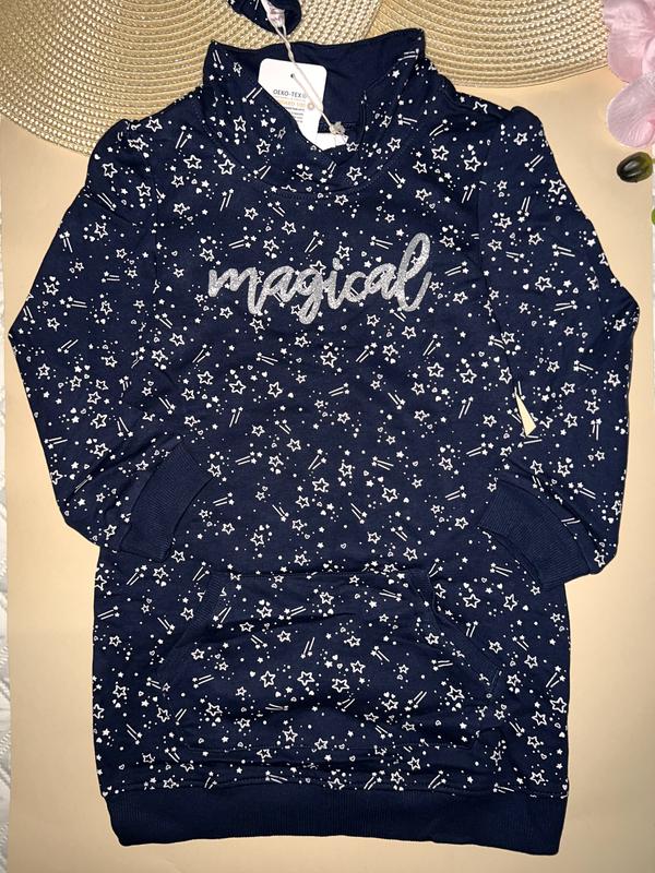 Кофта - туника для девочки утепленное, темно синего цвета в звездочки + плата для куклы. Надпис на платье мерцает серебряными блестками. Размер: 116 см.
