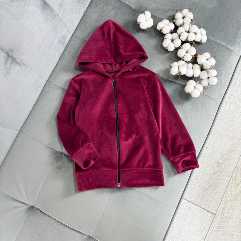 Кофта велюрова на замочку. З капюшоном. Тканина королівський велюр. Виробник Україна. Заміри: (98-104) - довж. 42 / напівобхват 31 /рук.32 (110-116) - довж. 44 / напівобхват 33 /рук.35 (122-128) - довж. 46 / напівобхват 35 /рук. 40 (134-140) - довж. 48 / напівобхват 36 /рук. 44