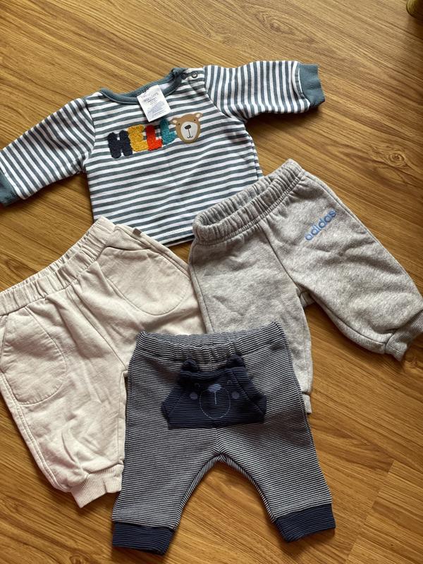 Сірі спортивні штани adidas для дітей від 3 до 6 місяців зроблені з якісного матеріалу бавовна. Ідеальний вибір для комфортного гардеробу малюка. Ціна :150грн Сині 0-3місяці ,50 грн Молочні штани теж 50грн Кофточка тепленька 100грн Безрукавка 250грн Костюмчик теплий Міккі маус 300грн Для немовлят ще з біркою 200грн Костюмчик світлий 200грн Кофточка червона 100