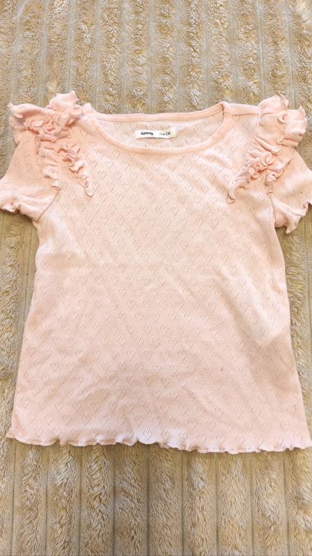 Нежная трикотажная кофточка пастельного розового цвета 🌷 С рюшами на плечках и ажурным узором - очень милая и удобная. Приятная к телу, эластичная, красиво смотрится с юбочкой или джинсами. 📏 Размер: 116 см (около 5-6 лет) 👗 Состояние: отличный