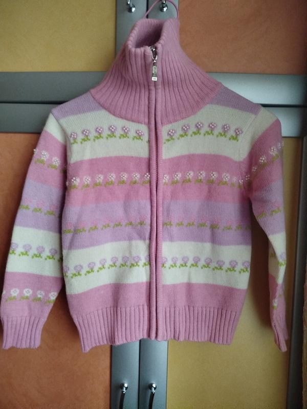Детская кофта для девочки, на 3-4 рочки. Состав кофты почти полностью натуральный, шерсть. Розовая с белым, с вышивкой, декорирована бусинами. Шерсть 80%. Замеры: Длина - 45, длина рукава - 43, резинка - 5,5, ворот - 15, плечо - 7,5. ПОГ - 39, ПОТ - 36, ПОБ (там, де резинка - 34). Стан идеален. 1/3 цены!