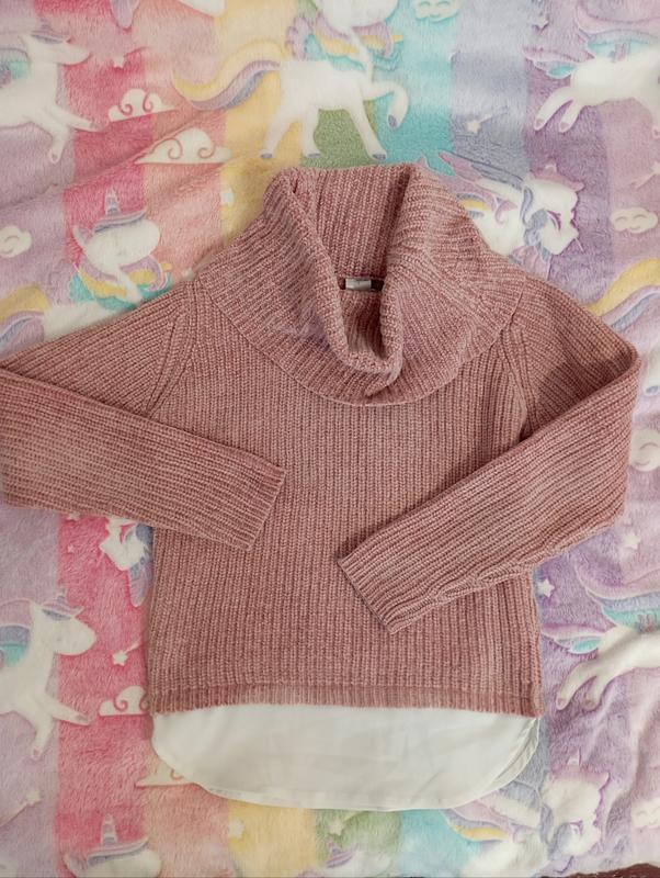 Теплый свитер с большим горлом,цвет пудра.В идеальном состоянии,только маленькая зацепка на белой ткани.Размер 134-140