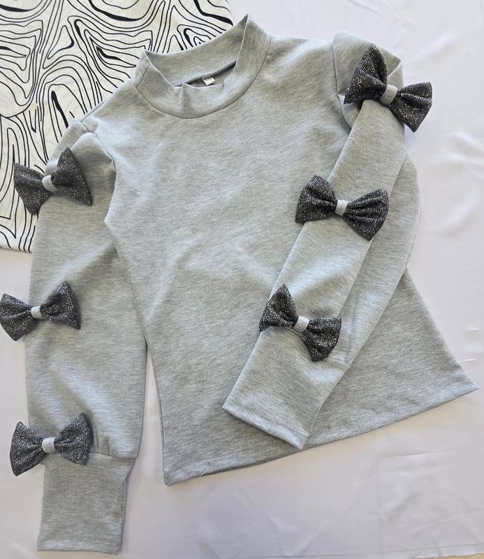 Невероятно красивая и нарядная кофточка. Объемный рукавчик. Украшена съемными бантиками (на булавках), при желании можно носить чистой. Ткань: французский трикотаж замеры +- 1-2см размер/ длина рукава от плеча,/ длина/ пог 🌺122-128/49/45/31-1шт 🌺134-140/53/49/33-1шт