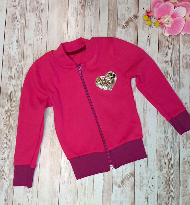 Стильная ярко-малиновая кофта для модницы. Застёгивается на молнию, низ и манжеты — резинка. Украшена сердечком из пайеток. Состояние: новое. Производство: Турция. Состав: 60% хлопок, 40% полиэстер. Замеры: длина 35 см, ширина 28 см, ширина по плечам 24 см, длина рукава 34 см.