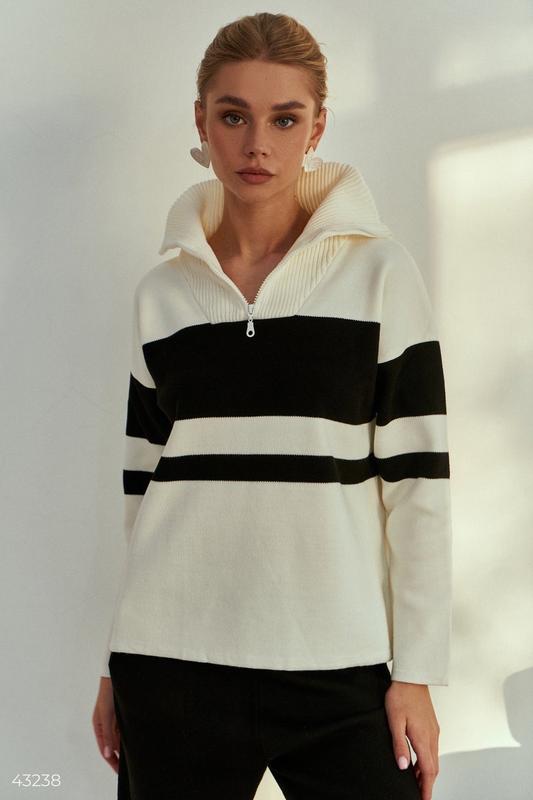 Кофта у смужку виконана із трикотажного матеріалу з перевагою бавовни у складі. Модель крою oversize зі светром з горловиною стійкою на змійці. Котон 50%, акрил 50%