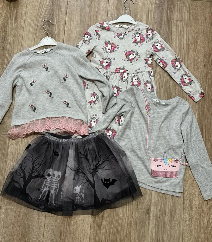 Набір для дівчинки 4-6 років(110-116 см ) фірма H&M, всі речі в ідеальнішому стані, плаття єдиноріг , реглан з імітацією сумочки, легкий светрик з мереживом, юбка з фатином.