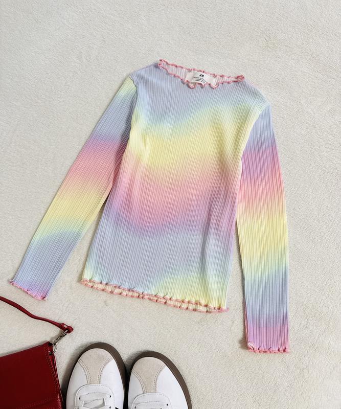 Кофтинка від H&M Кольору веселки Розмір 4-6 р на зріст 110/116 см 94% котон, 6% еластан По грудей 26 см Рукав 47-40 см Довжина 40 см