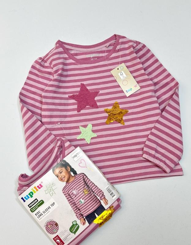Очень красивый лонгслив на девочку от lupilu из новой коллекции.Выглядывает очень стильно, кофейка идут на резинках,звездочки вышитые паэтками, меняют цвет. кофтинки идут в упаковках поэтому можно презентовать на подарок. Склад 100%хлопок. замеры 110 116 на 4-6 лет длина 46 см ДПГ 33 см длина рукава от плеча 40 см