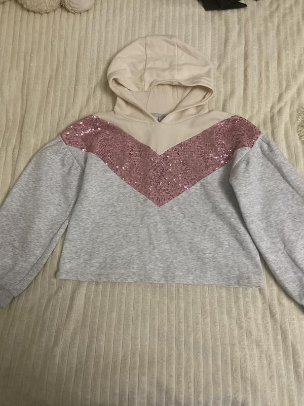 Кофта з капішоном на 11~10 років.В гарному стані.Сірого кольору з молочним капішоном,вставка рожеві пайєтки.Двонитка тепла.Довжина рукава 59~60 см.