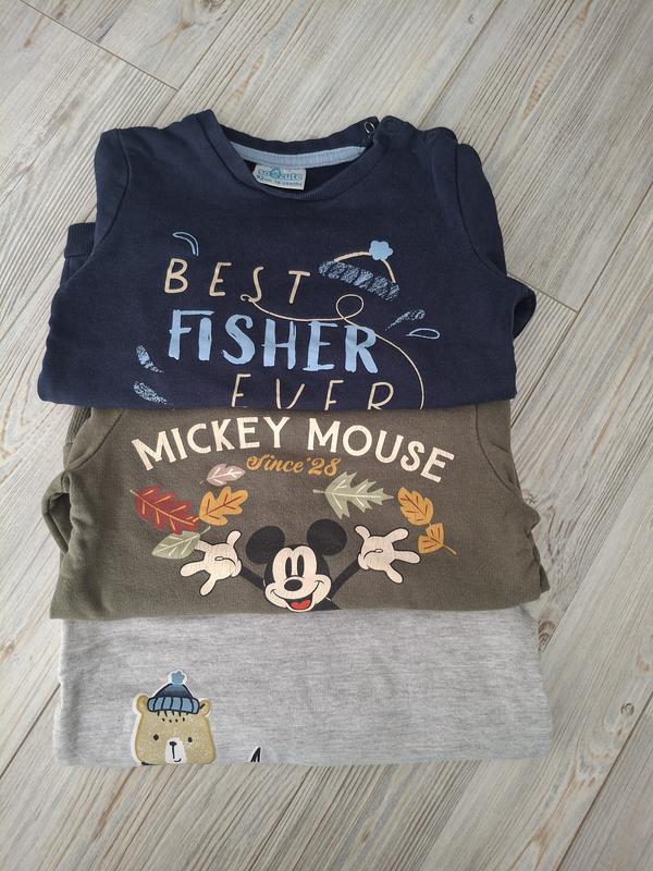 Набір кофт, світшотів, на легкому флісі. Сірий, синій -so cute, хакі Disney baby, 18-24 міс, 92. Довжина 34, пог 29, рукав від горловини 35. Ціна за всі