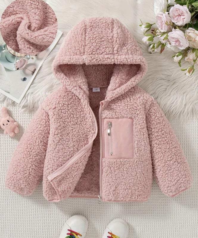 Дівоча затишна кофта з Флісовий підкладкою та кишені, довгі рукав однотонний рожевий колір повсякденна зовнішня мода для осені та зими. Затишне вбрання Осінь-зимову прогулянку, кофтина з капюшоном на блискавці . Заміри Довжина рукава 26,5 см Довжина кофти 35 см Ширина 34 см.