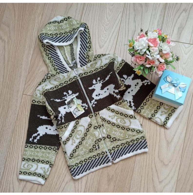 Очень теплая кофта с оленями, двойная вязка. На молнии, с капюшоном, под пояс. Новая, с биркой. Склад тканини: акрил. Длина 42 см, ширина 30 см, рукав 32 см. Обмену и возврат нет