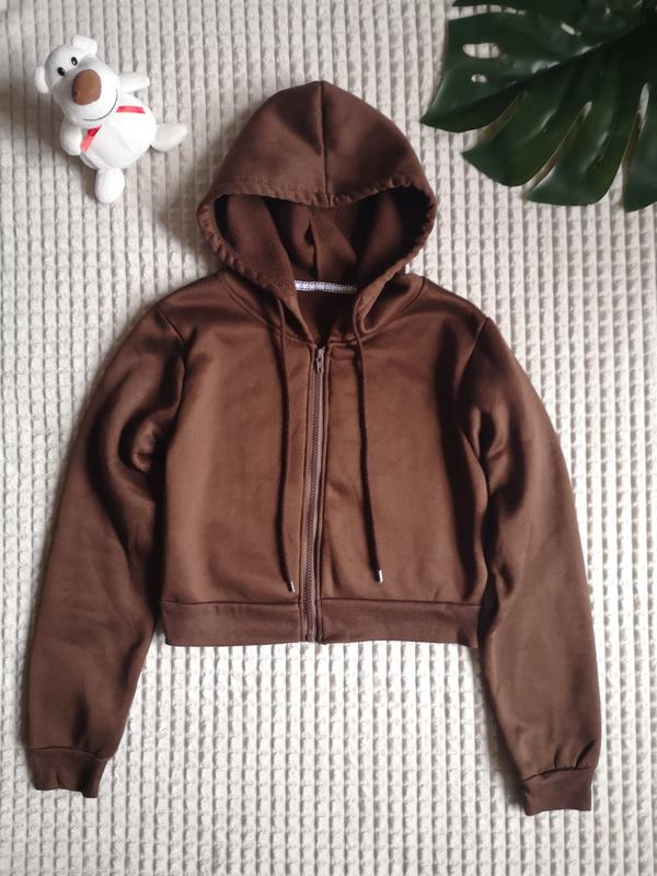 Красивая укороченная кофта с капюшоном на застежке для девочки. Утеплена флисом. Размер указанный XS, подойдет на девочку подростка 12+ лет. Замеры : длина 42, ширина по груди 44, рукав 56, из них 5 манжет.