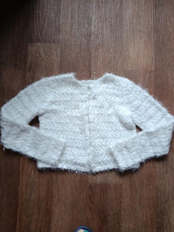 пушистое, белое с серебряными летчиками Длина от плеча до низа 37, плечо 9, рукав 51, ширина под руками 36