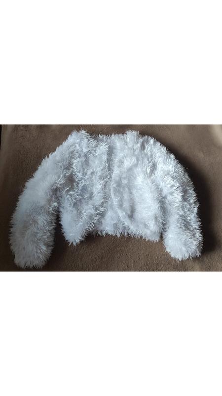 Белое болеро "травка". Размер смотрите по замерам. Надели и в 4 года и в 7. длина по спине 30 см, рукав от шеи 42 см,ширина 34 см. Очень тянется.