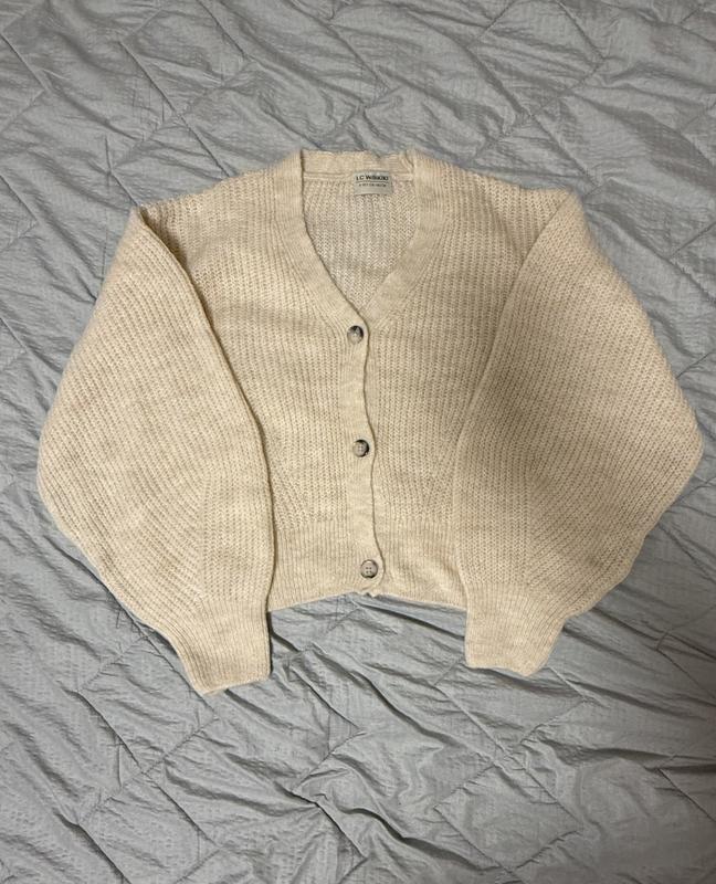 Теплий, але легкий кардиган для дівчинки 9-10 років на зріст 134-140 см Колір світло-бежевий, ближче до молочного. Новий, але без бірки.
