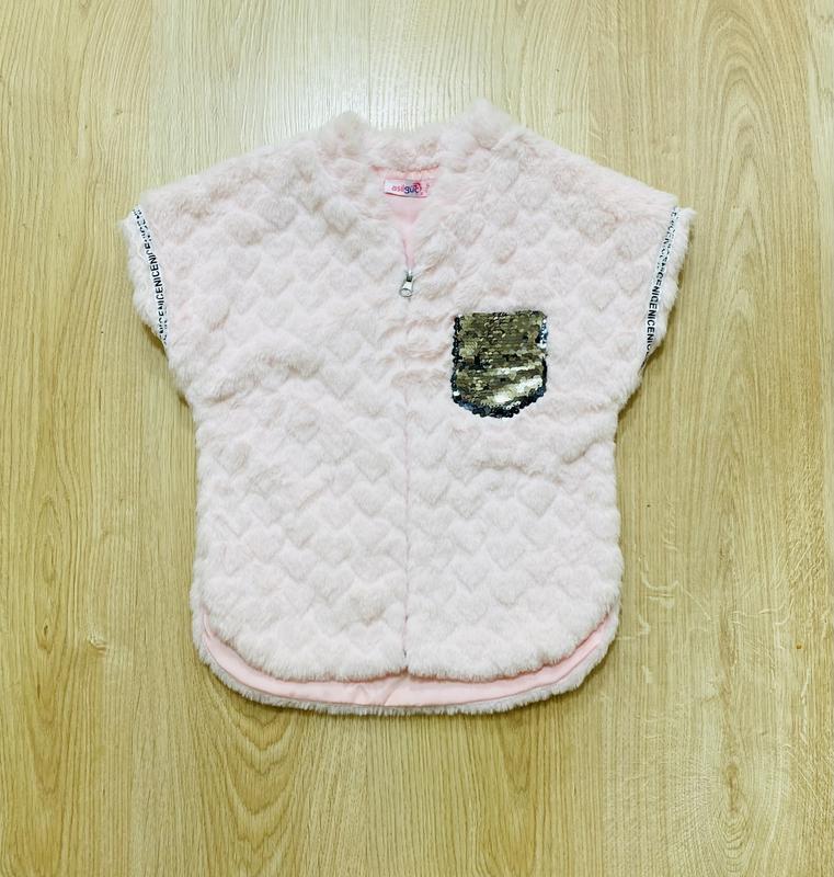 Жилетка мєховушка, тонка без утеплення. Ніжно рожевого кольору. На змійці. Збоку карманчик з паєтками. Розмір 116 - довжина по спинці 46 см (перед коротший на 4 см), по плечах 46 см, напівобхват грудей 38 см.